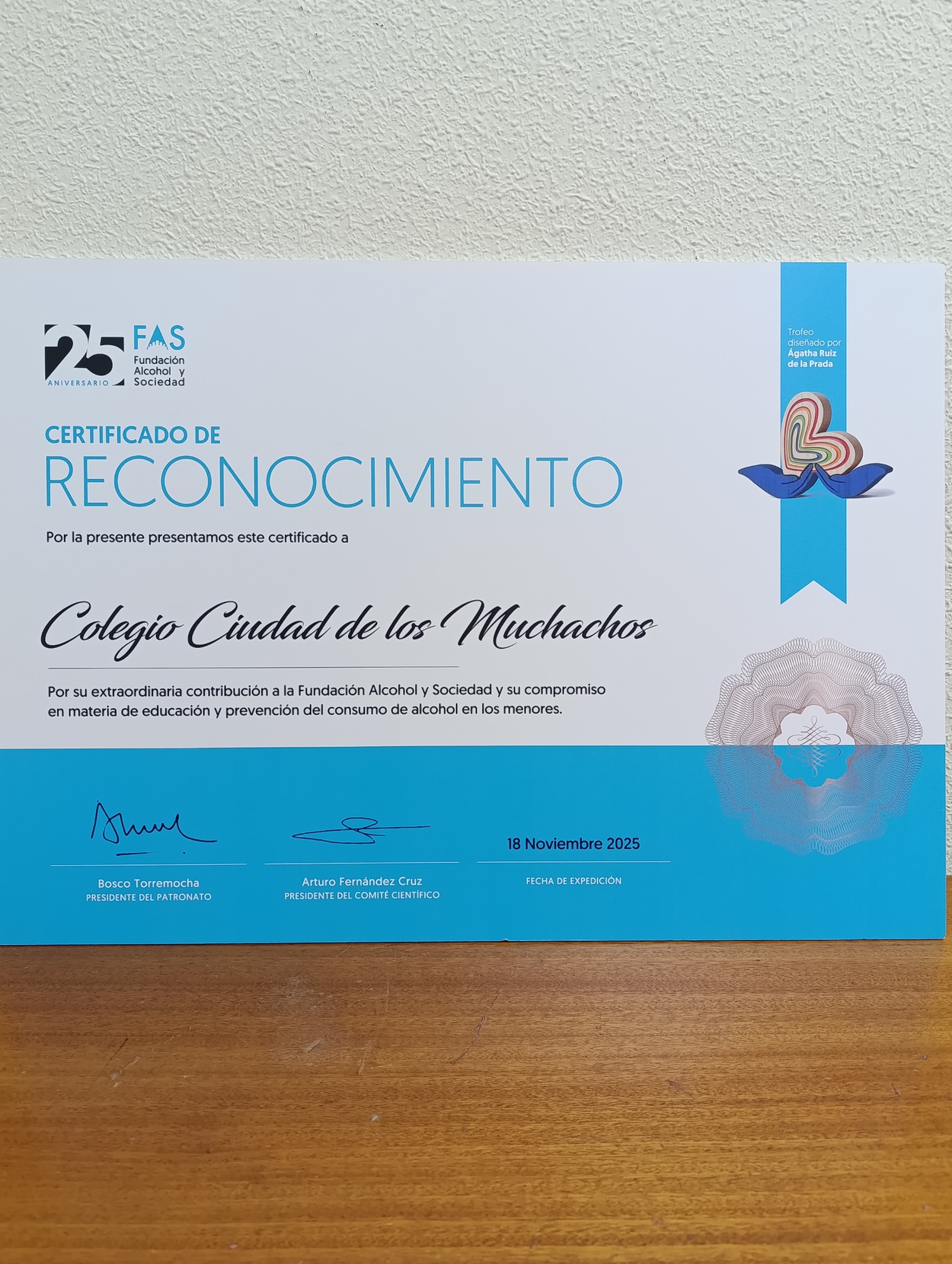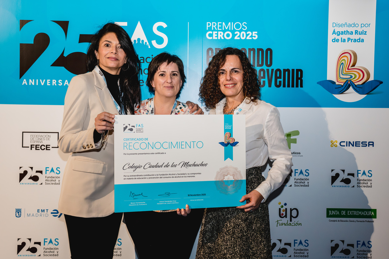 El pasado martes, 18 de noviembre, la Fundación Alcohol y Sociedad (FAS) celebró en Madrid un acto por sus 25 años de vida con una gala en la que entregó sus premios ‘Cero 2025 Educando para Prevenir’, coincidiendo con la Semana de la Infancia. Entre los premiados, la entidad galardonó al colegio de Salesianos Ciudad de los Muchachos (Madrid), en su “compromiso en materia de educación y prevención del consumo de alcohol en los menores”.