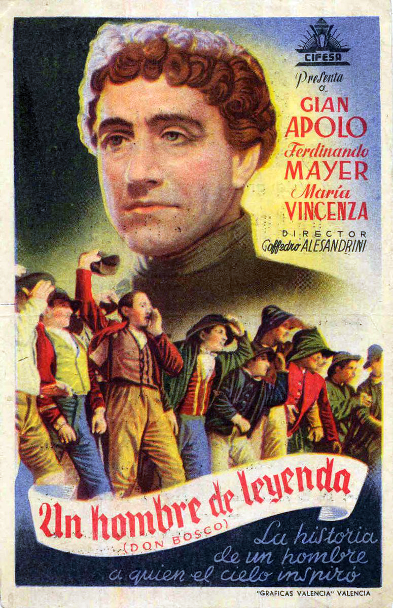 La primera película dedicada a la figura de san Juan Bosco fue la titulada Don Bosco en 1935, un año después de su canonización. Es un filme italiano, de la productora Lux Film. Dirigida por Goffredo Alessandrini, Don Bosco es interpretado por Gianpaolo Rosmino, uno de los actores con más renombre de aquella época en el cine italiano. La cinta dura 90 minutos, está filmada en blanco y negro -ese mismo año se proyectó el primer largometraje en color, La feria de las vanidades de Rouben Mamoulian, con la técnica visual del Technicolor– y con sonido, en italiano -ya en 1927 aparece la primera película sonora que comienza a desbancar al cine mudo, El cantor de Jazz, dirigida por Alan Crosland-. El elenco de actores lo completó, entre otros, María Vincenza Stiffi o Ferdinando Mayer. En España fue distribuida por la empresa valenciana Cifesa (Compañía Industrial de Film Español, S.A.) y nombrada bajo el título “Un hombre de leyenda (Don Bosco)”. En la parte inferior del cartel promocional se puede leer: “La historia de un hombre a quien el cielo inspiró”. Fue estrenada en España el 17 de abril de 1936, en un momento muy convulso política y socialmente, a tres meses del comienzo de la Guerra Civil (1936-1939).