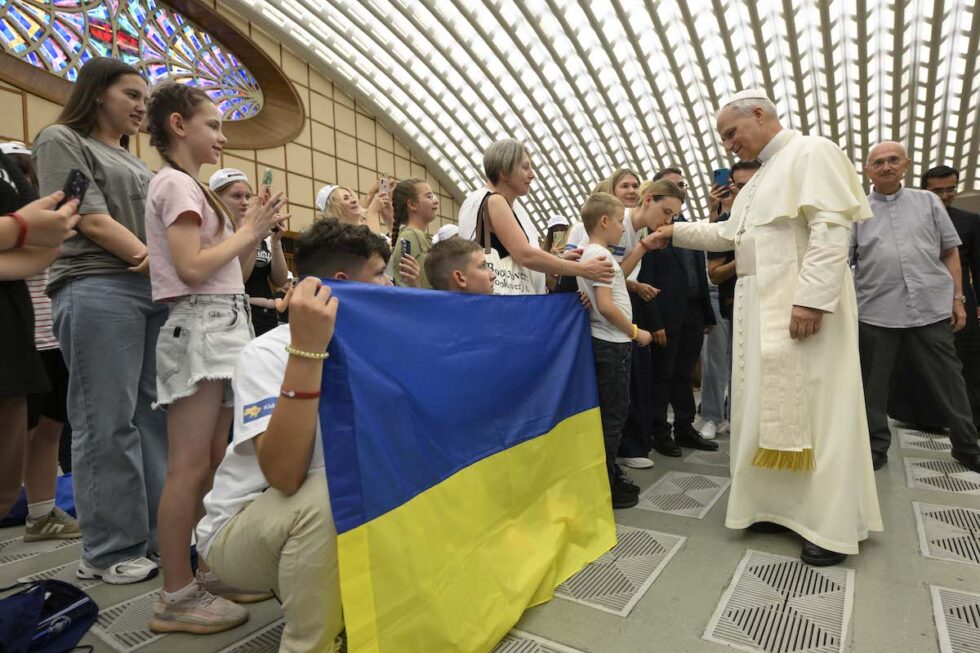 El Papa acudió ayer por la mañana al Aula Pablo VI para saludar al grupo que participa en el proyecto "Estate Ragazzi", al que se han unido jóvenes procedentes del país en guerra y acogidos por la Cáritas italiana. Un campamento organizado por los Salesianos en el Vaticano.