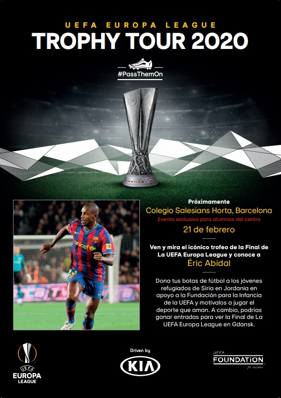 En un evento estrictamente privado y no abierto al público, Salesianos Horta acoge este viernes 21 de febrero el Tour del trofeo de la UEFA Europa League 2020, promovido por Kia Motors. La organización del evento trae al colegio el trofeo junto con una leyenda del fútbol, el exjugador del F.C. Barcelona, Éric Abidal y el influencer delantero 09.