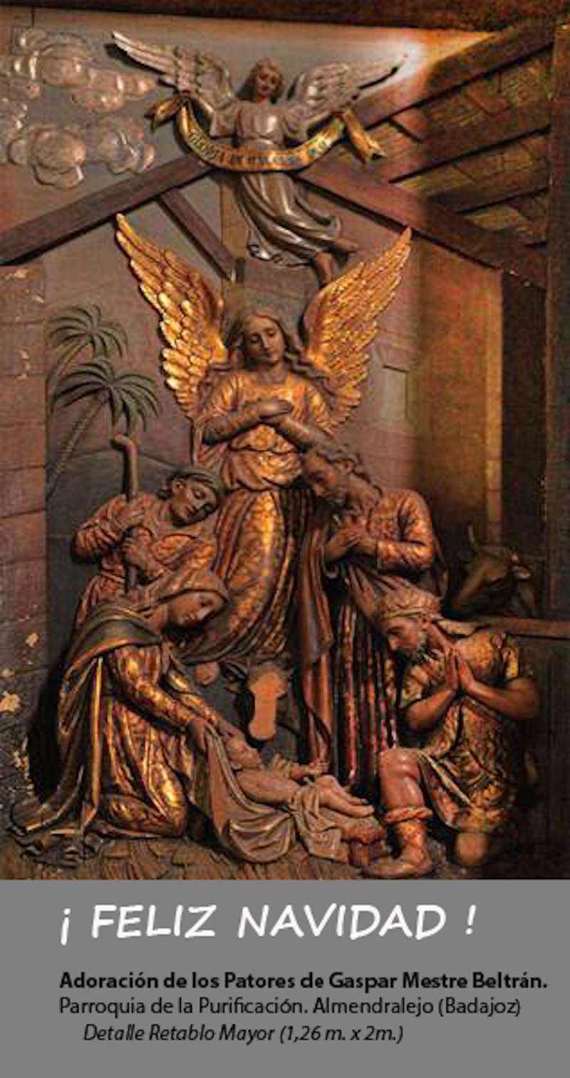 Nuestra felicitación para esta Navidad es una imagen de la Adoración de los Pastores, un detalle del altar mayor de la Parroquia de la Purificación de la localidad de Almendralejo, provincia de Badajoz.