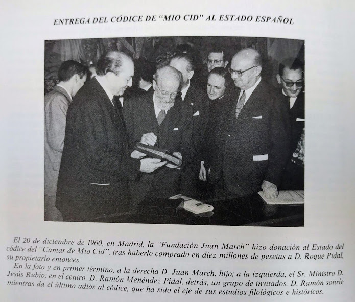 El acto de la firma de la escritura, celebrado el 20 de diciembre de 1960, por cuyo efecto el manuscrito pasaba a manos de la Biblioteca Nacional de España, tuvo lugar en la sede de la Fundación Juan March y acogió a más de un centenar de asistentes. Entre ellos, un emocionado Ramón Menéndez Pidal, que puso de relieve la significación de este códice: “Su valor como primer monumento de nuestra literatura en el que se funden como en ningún otro el valor nacional y el lingüístico”.