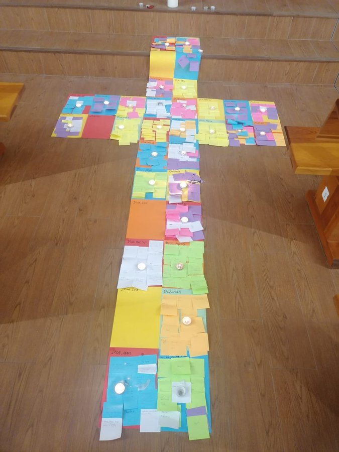 Los alumnos de Formación Profesional de Salesianos Loyola tuvieron un momento de oración en la capilla del colegio elaborando una cruz con los nombres de sus seres queridos pidiéndole al señor que brille para ellos la luz eterna.