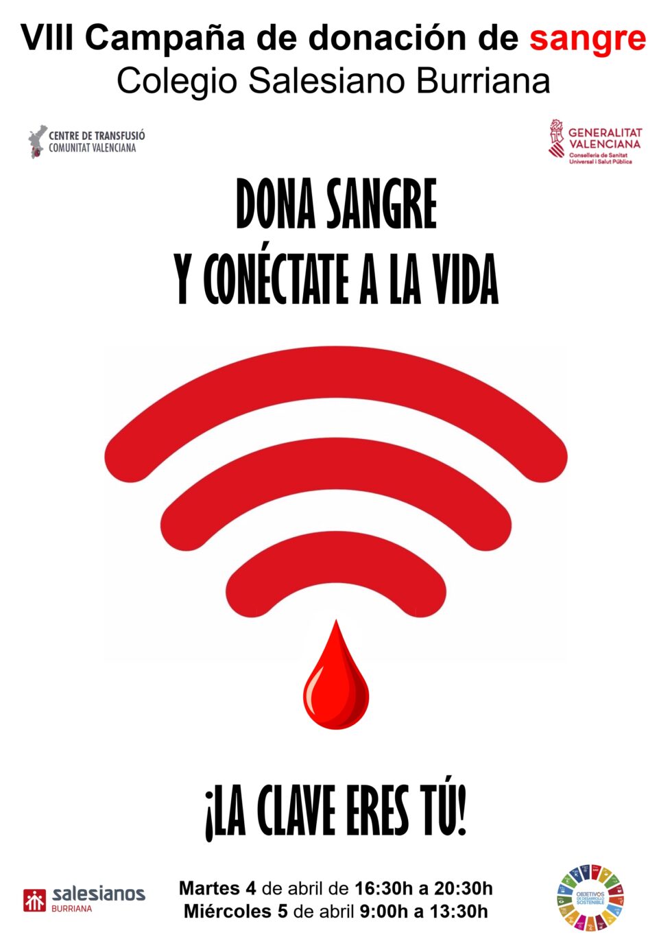Salesianos Burriana convocó para este martes y miércoles, 4 y 5 de abril, una nueva edición de la Campaña de Donación de Sangre, organizada con la implicación de los alumnos de Bachillerato voluntarios en la experiencia Aprendizaje-Servicio y bajo el lema «Dona sangre y conéctate a la vida ¡La clave eres tú!». Las extracciones están teniendo lugar en la planta baja del colegio el martes por la tarde y el miércoles día 5 por la mañana.