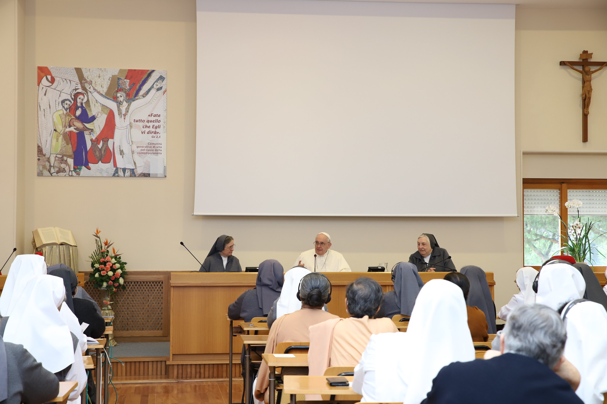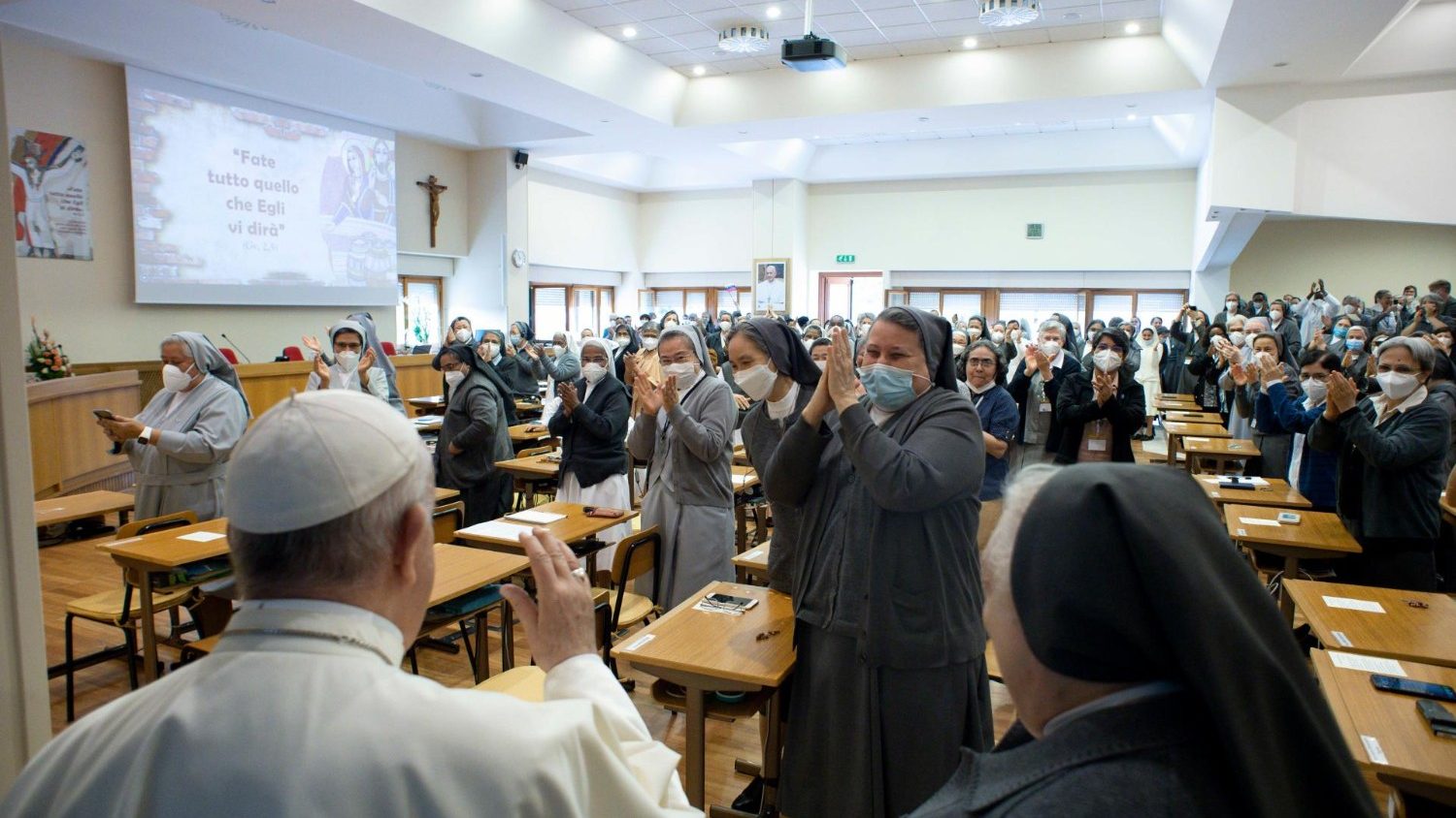 A continuación, el papa Francisco, con su estilo sencillo y familiar, dirigió su palabra a las capitulares, valorando la centralidad de María en la reflexión capitular y las invitó a hacer como ella: “Nunca apropiarse de algo para sí mismas, e indicar siempre a Jesús”.