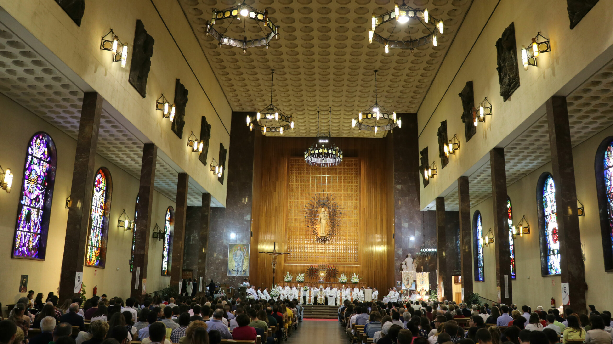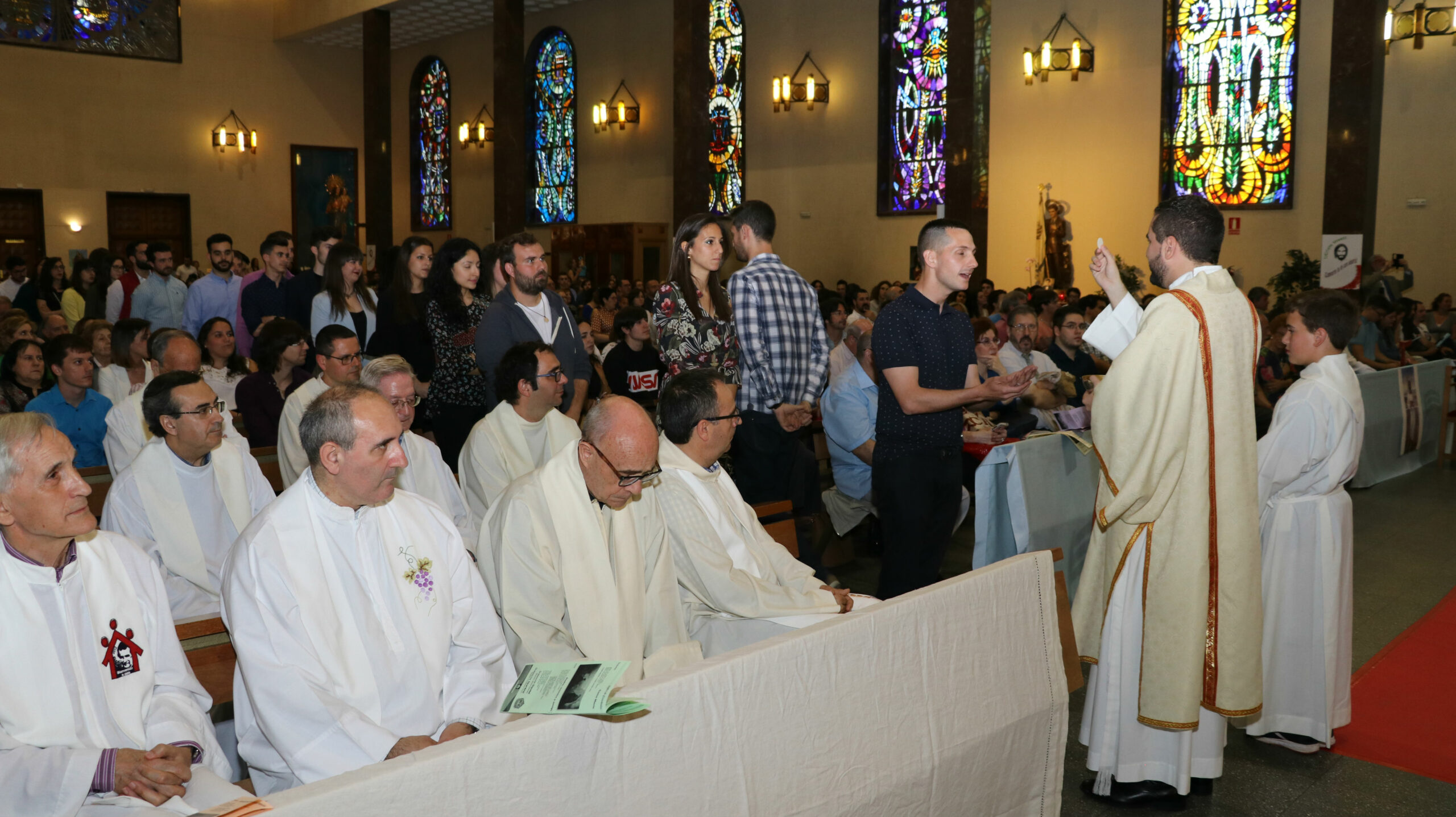El Santuario se había llenado de vida. Muchos jóvenes y no tan jóvenes procedentes de las diferentes casas donde Rubén y Ramón han vivido (Fuenlabrada, Salamanca-Pizarrales, Domingo Savio de Madrid, Pinardi, Salesianos Atocha…) y de toda la Inspectoría. En el altar y en algunos de los primeros bancos, un número importante de sacerdotes de las distintas presencias inspectoriales, el vicario diocesano, el inspector de Salesianos María Auxiliadora… En el signo de imposición de manos y en el gesto de paz, se acercaban y compartían “su felicidad” con los protagonistas.