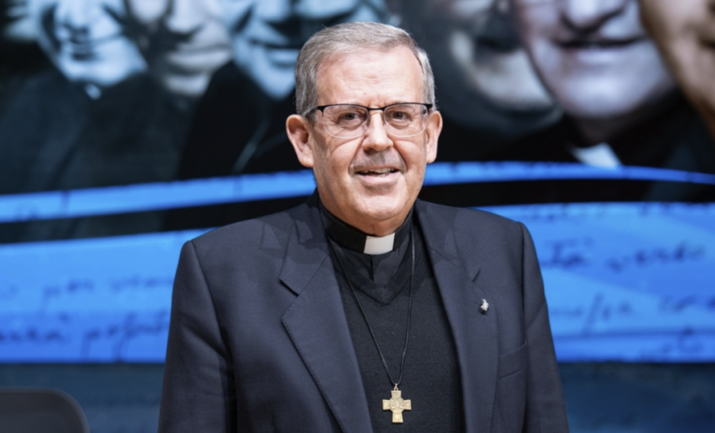 El póster incluye los elementos textuales del lema del Aguinaldo 2025 y, en la parte superior derecha, una reinterpretación en clave salesiana del logotipo del jubileo 2025.