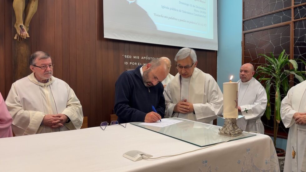 Momentos significativos de la ceremonia fueron la oración de toda la comunidad por Andrés, la recitación de la fórmula de la profesión religiosa y la firma de los documentos oficiales de entrada en la Congregación, y la entrega, a Andrés, del libro de las Constituciones salesianas y la medalla como salesiano de Don Bosco con votos temporales.