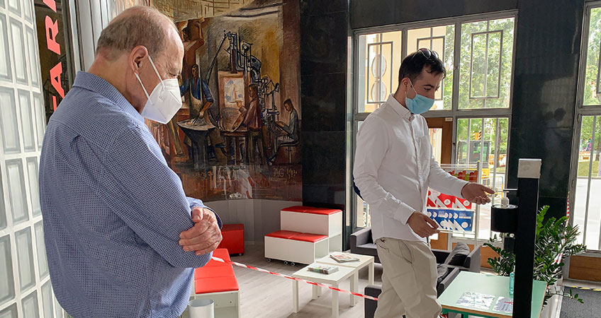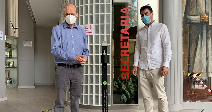 El estudiante ha cedido el dispensador a la escuela de Salesianos Sarriá que lo instaló en portería para el periodo de matriculaciones para garantizar, así, la seguridad de las personas que se acercan al centro a realizar los trámites administrativos.