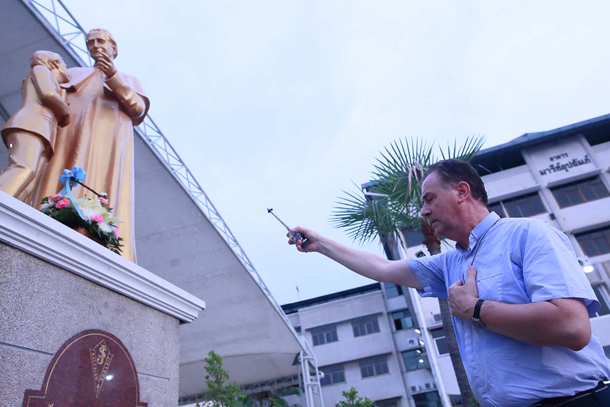 El domingo, 15 de mayo, don Ángel comenzó el día bendiciendo el “Patio de la Divina Misericordia”, situado frente a la Iglesia de María Auxiliadora en Bangkok. Pudo reunirse con la Asociación de María Auxiliadora (ADMA) en este mes de mayo dedicado a la Virgen de Don Bosco: “Ustedes tienen la misión de recordarnos a todos que Nuestra Señora debe estar presente en la misión salesiana”, dijo. Y pudo visitar además las tres comunidades salesianas de Sarasit (la escuela Sarasit, la Escuela Técnica “Don Bosco” y la Casa Nazareth), donde se encontró con los salesianos de todas las presencias de la zona.